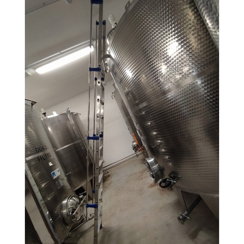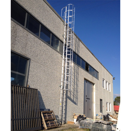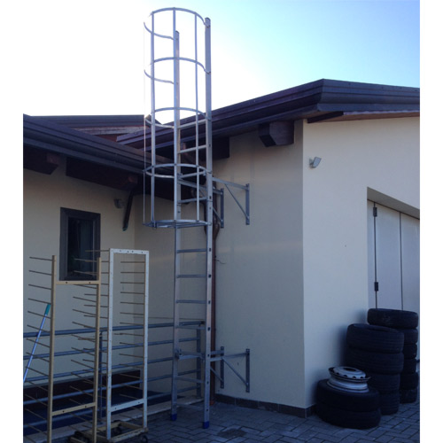 Scala in alluminio modulare, completa di protezione esterna a gabbia composta da elementi modulari in alluminio concepiti per adattarsi perfettamente alle scale seguendo la logica con la quale queste sono state concepite (D. Lgs. 81-08)